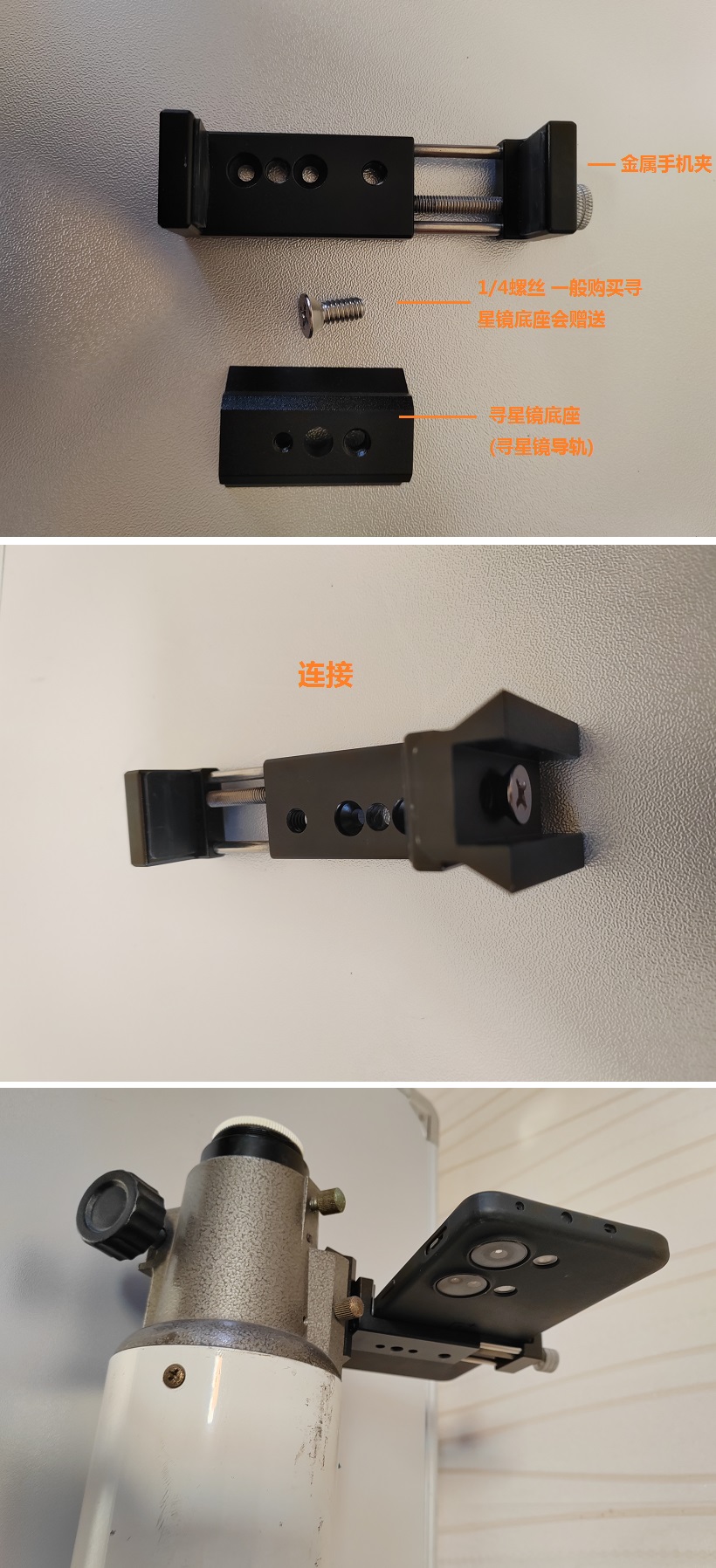 很多入门型望远镜的抱箍上已经有手机夹连接转置,可以直接连接手机夹,手机夹建议用金属的:
