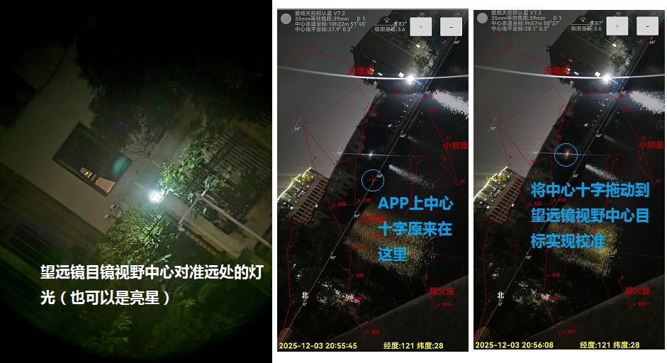 如果手机支架不是很牢固,大范围移动后可能导致手机中心十字和望远镜视野中心不再严格对准同一目标,可以找一颗尽量靠近目标的亮星进行第3步校准。